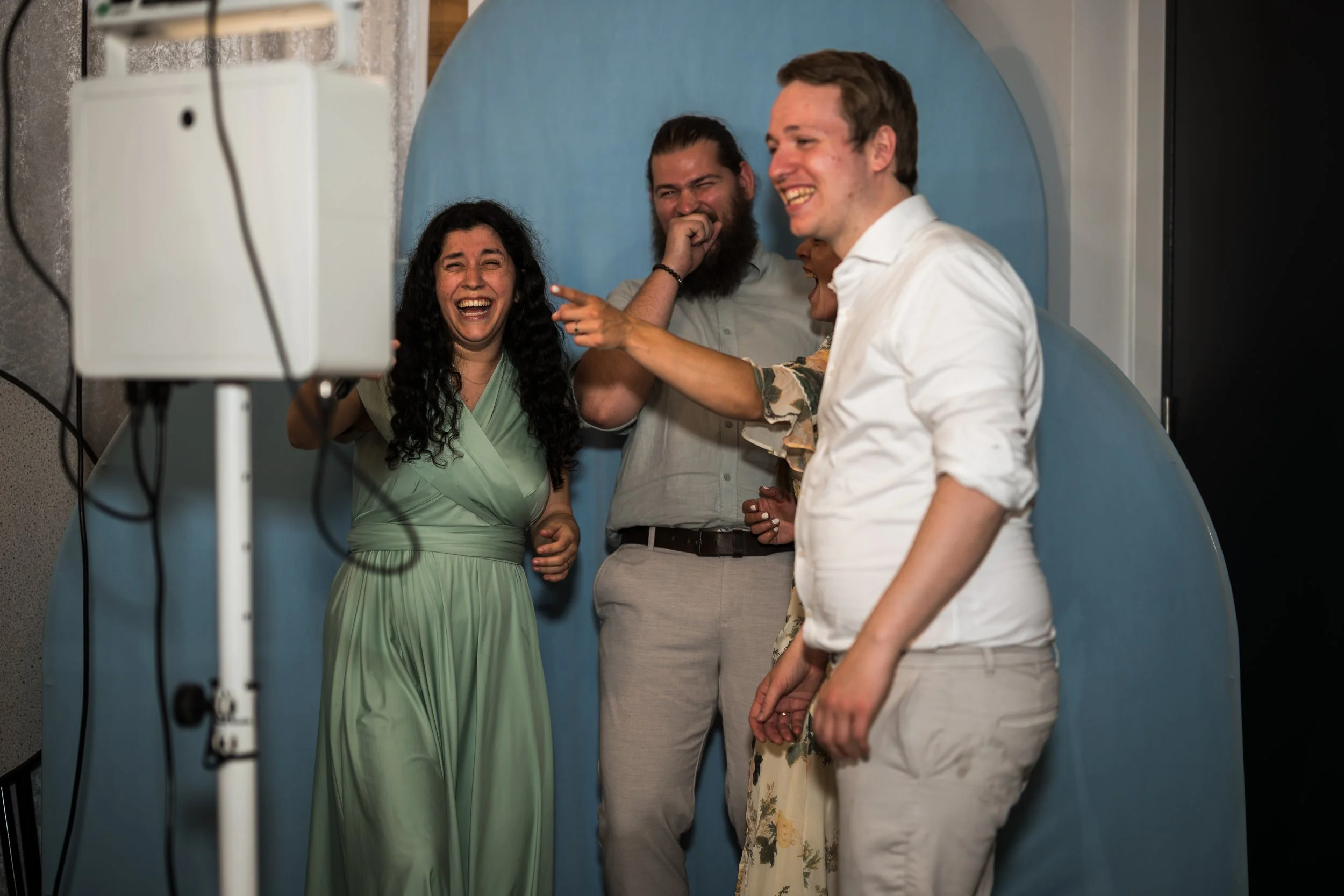 Group of five friends laughing and having fun during a photo booth session, with a blue backdrop.