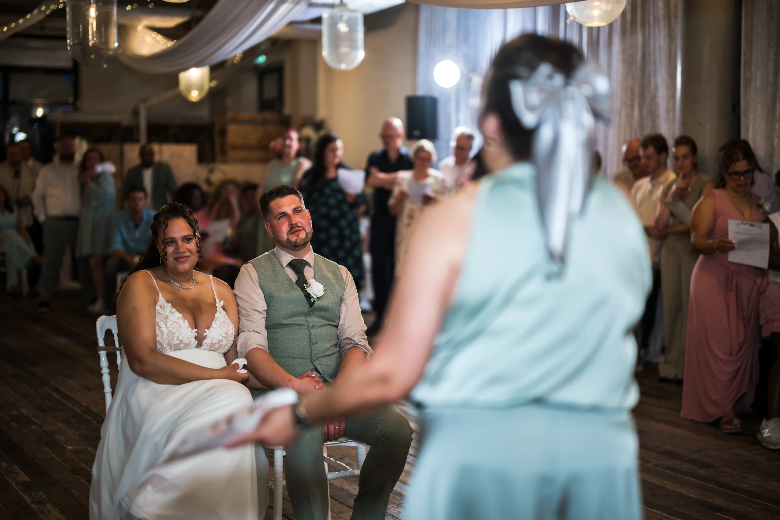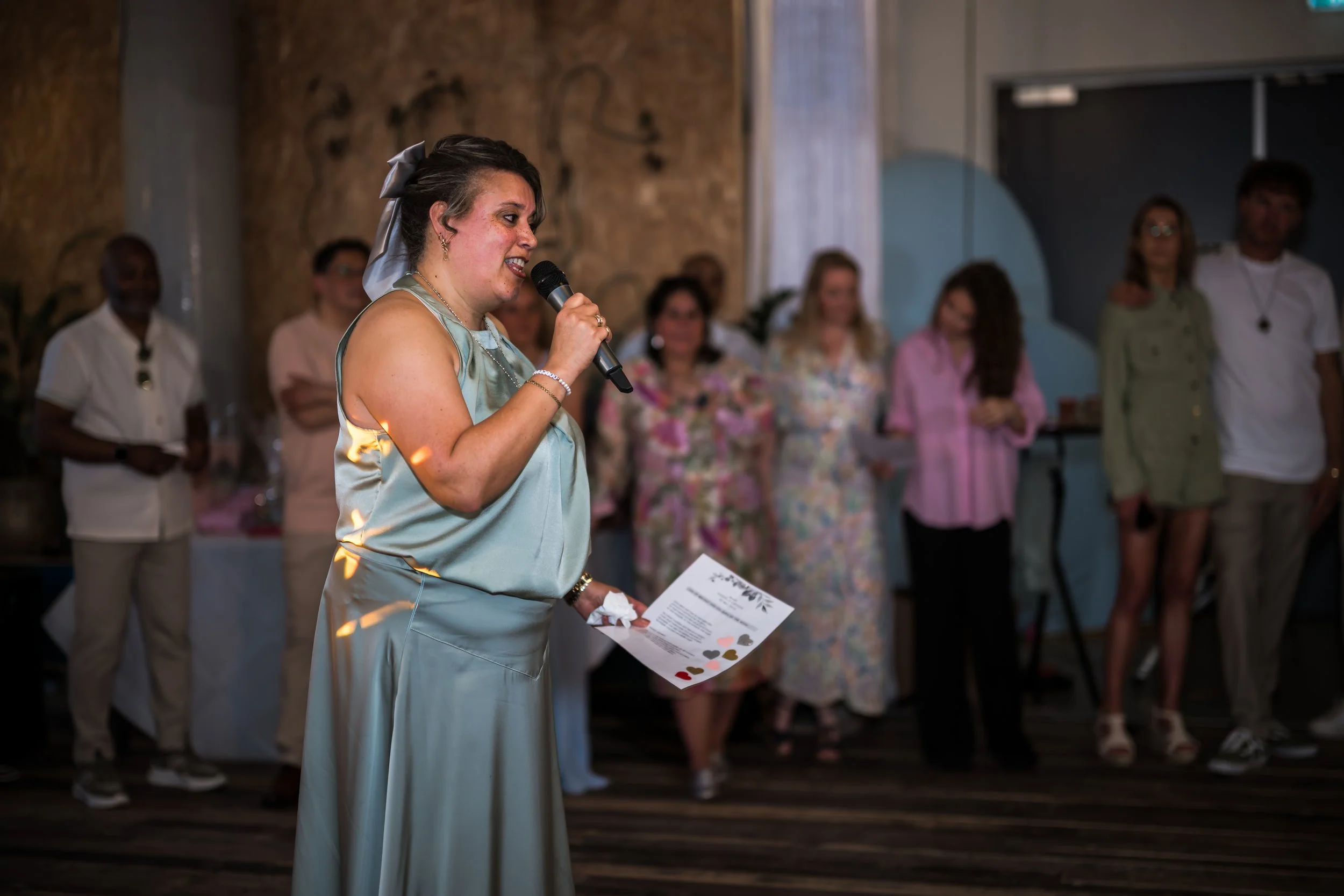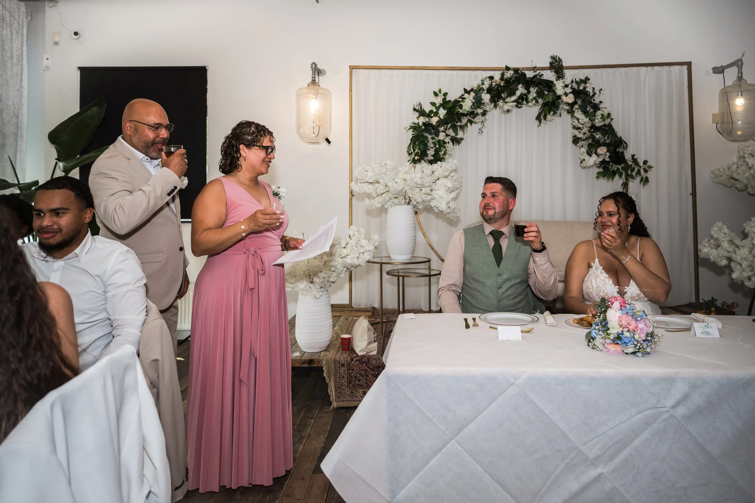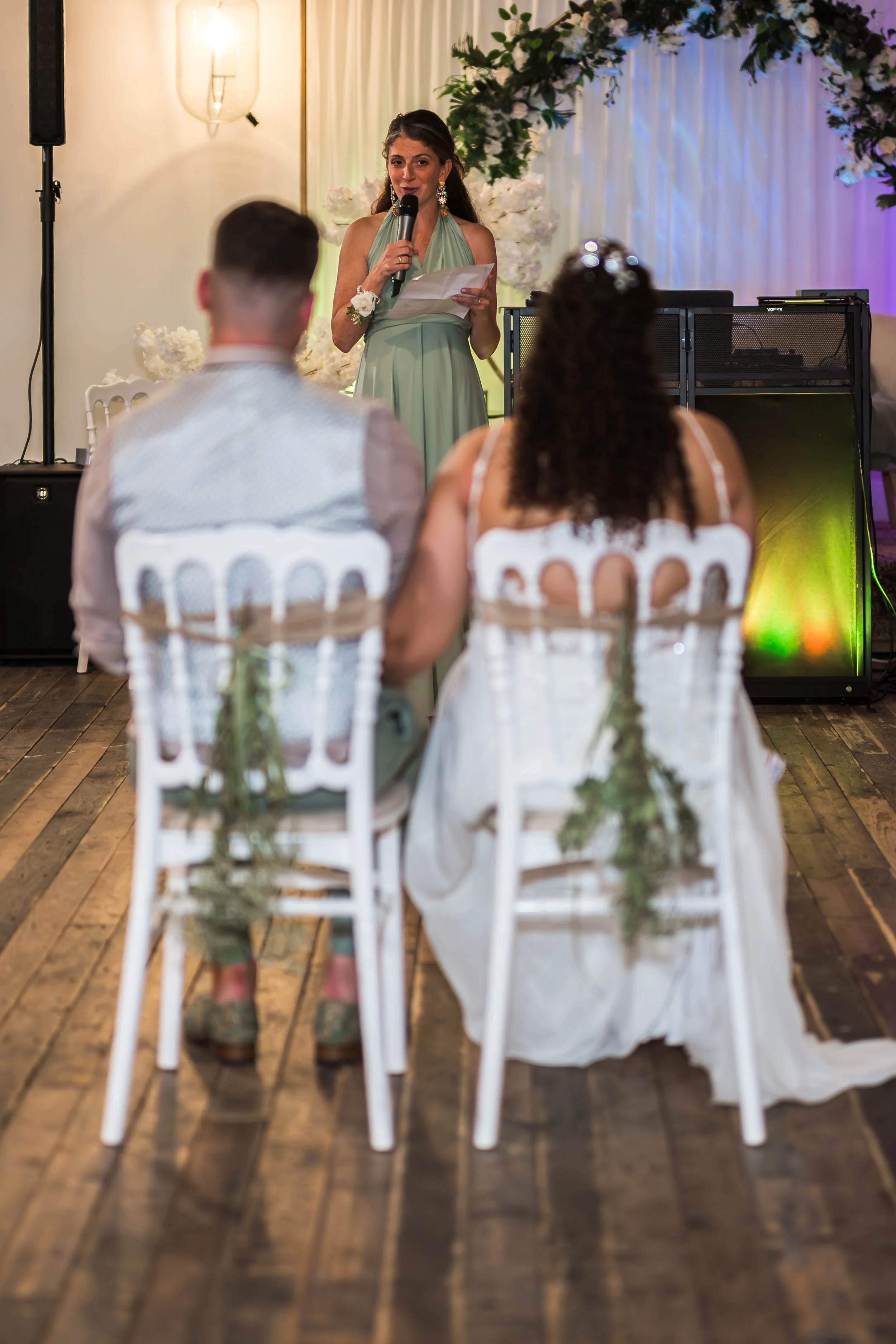 A woman in a light green dress giving a speech at a wedding reception, with a bride and groom sitting and listening. The venue has floral decorations and wooden flooring.