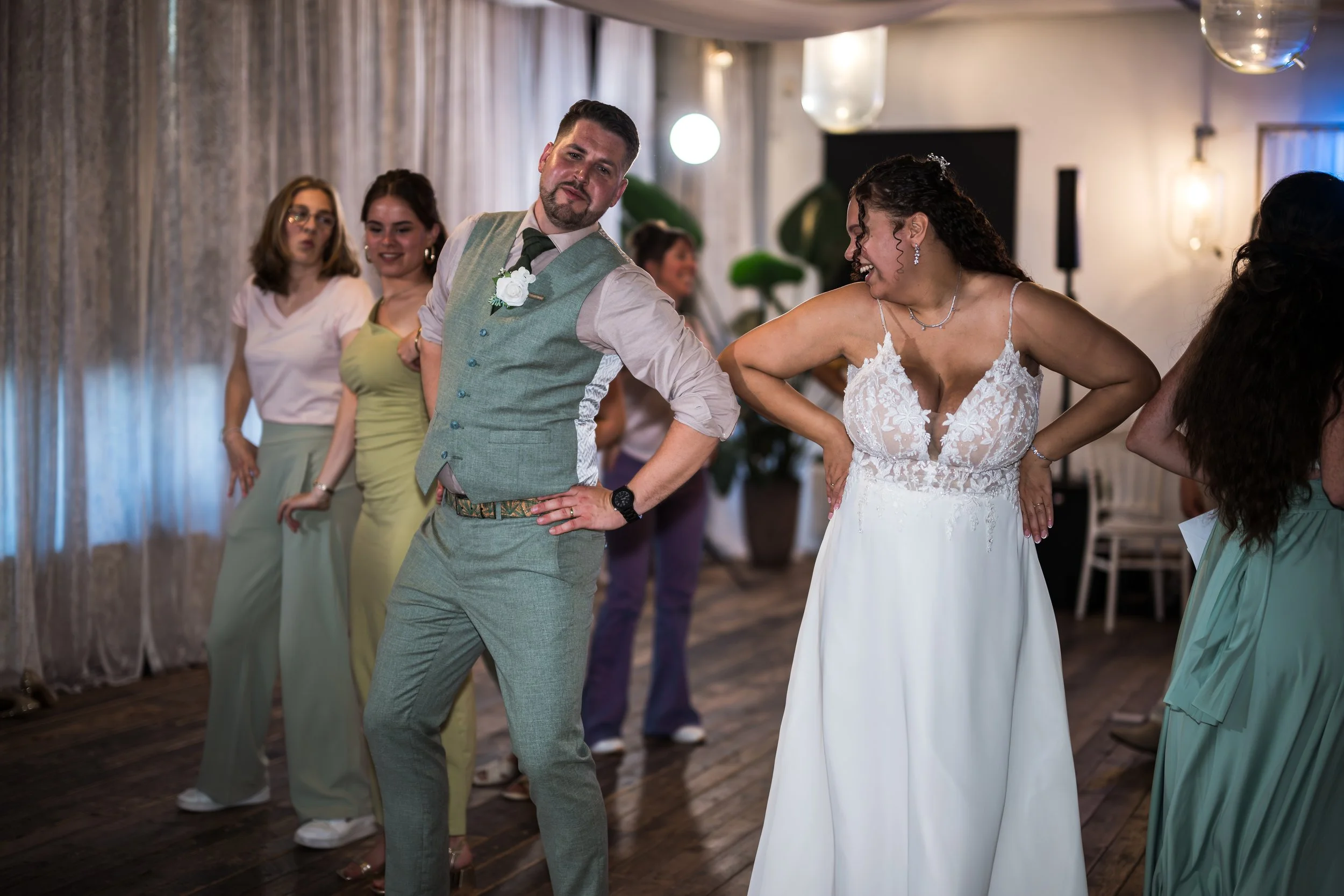 People dancing at a wedding reception. The bride is in a white wedding dress, and the groom is in a gray vest and pants. Others in the background are dressed in colorful clothes, enjoying the celebration.