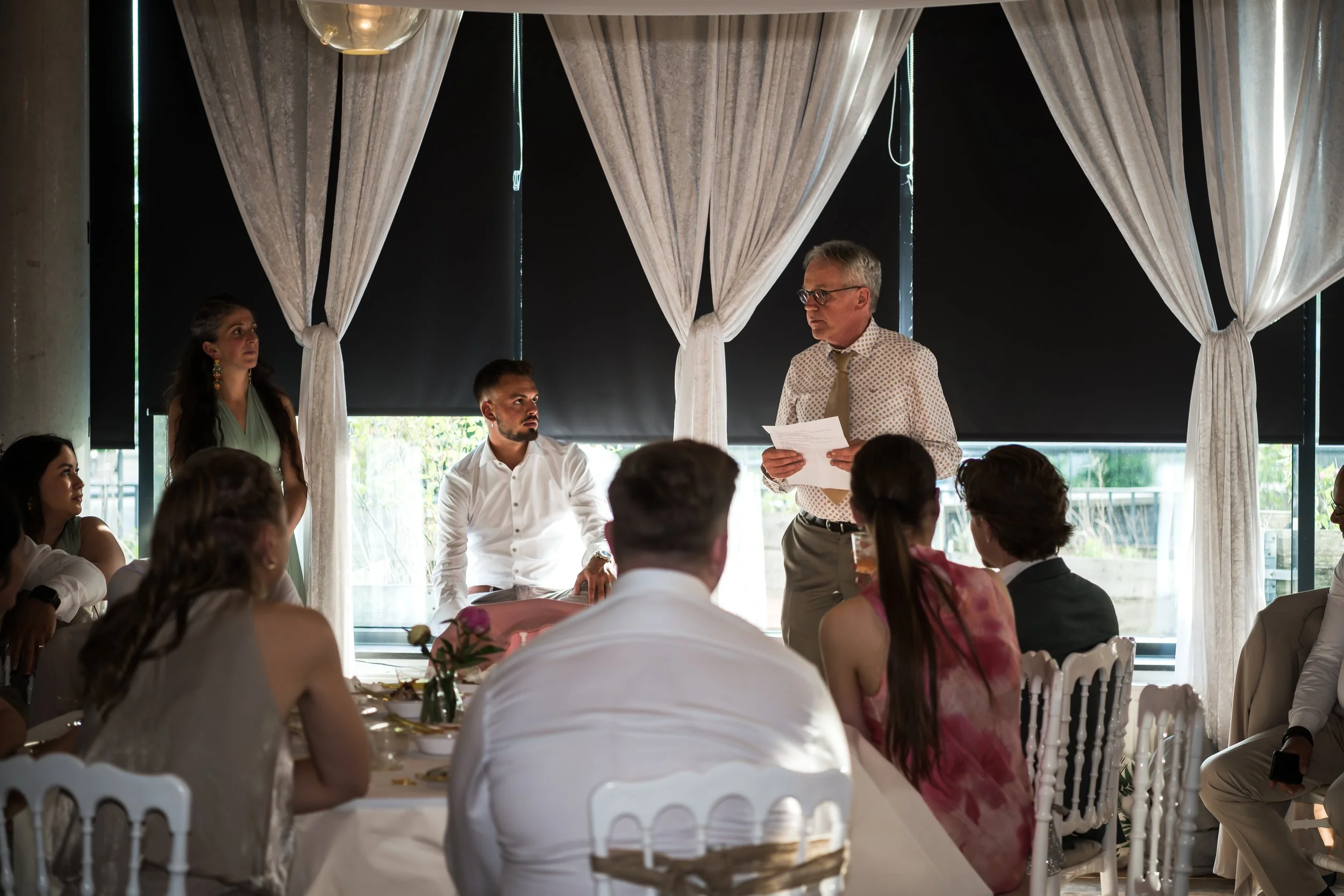 A man giving a speech at a wedding reception with guests seated around a decorated table in a room with large windows and curtains.