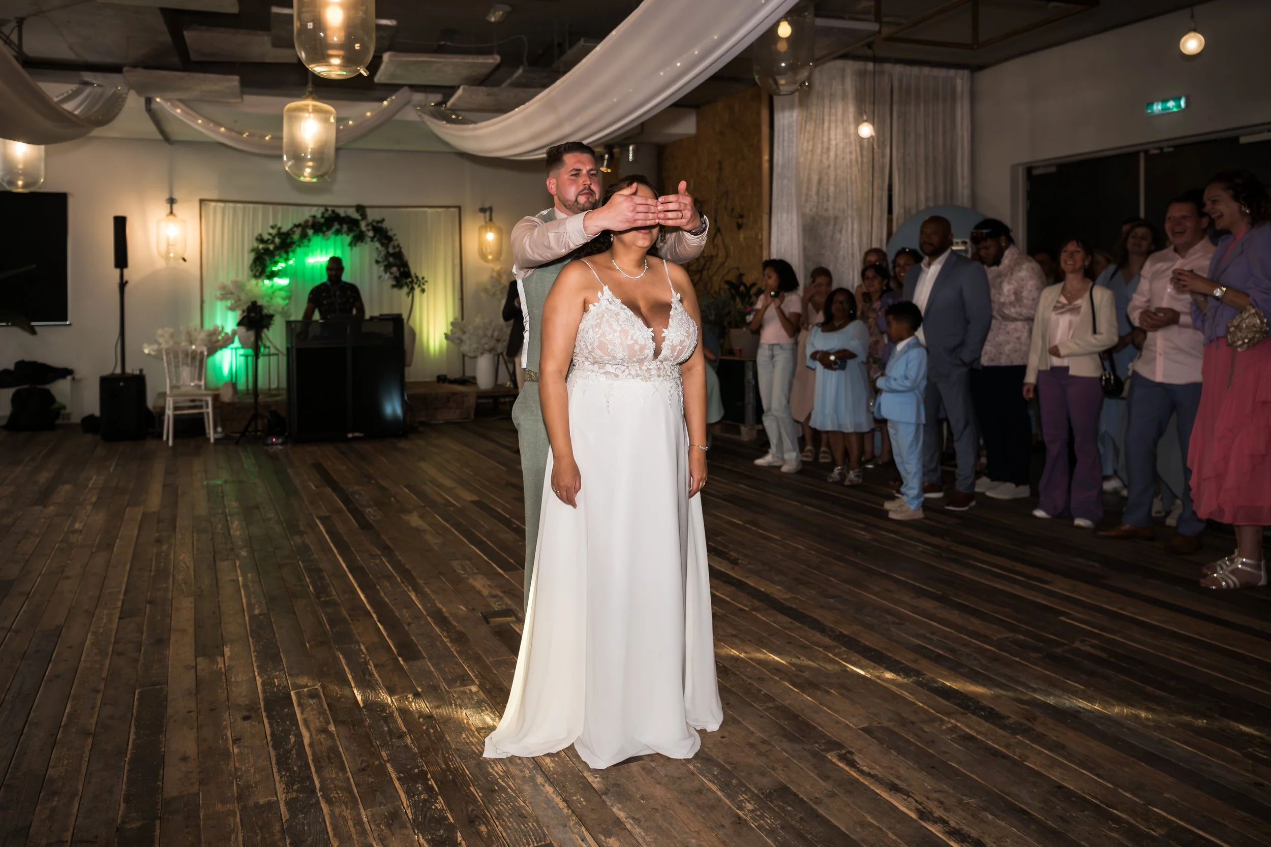 At a wedding reception, a groom covers the eyes of a bride as part of a game, with guests watching and smiling in the background, decorated with draped fabric and warm lighting.