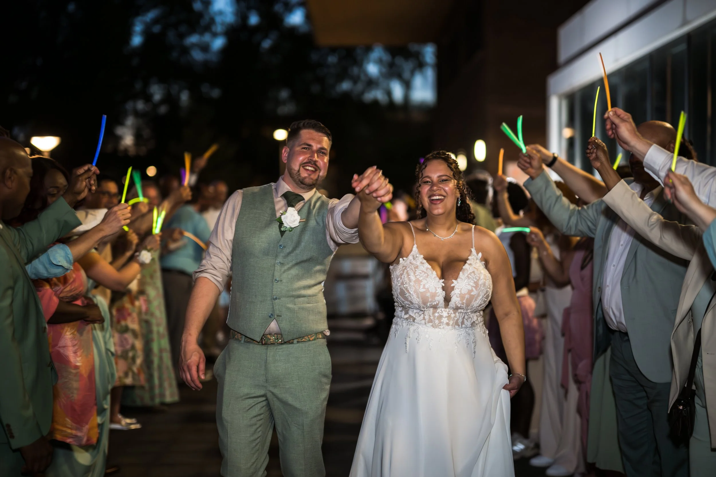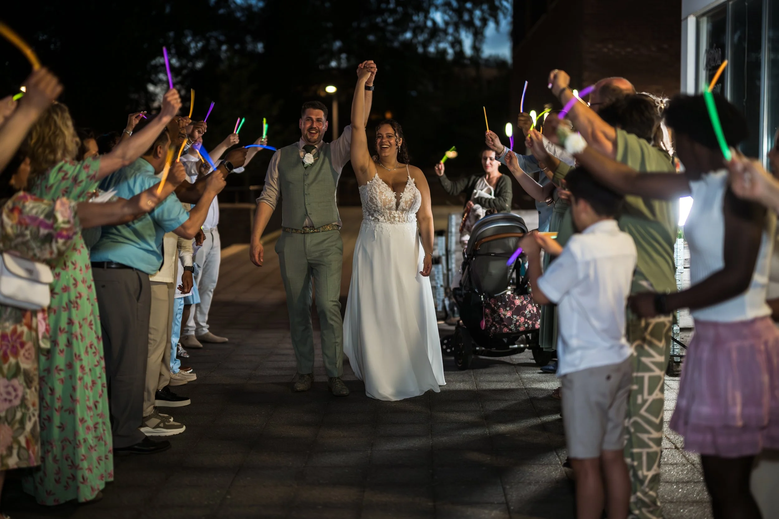 A newlywed couple celebrating at their wedding reception, holding hands up in victory, surrounded by guests holding glow sticks, with smiles on their faces at night.