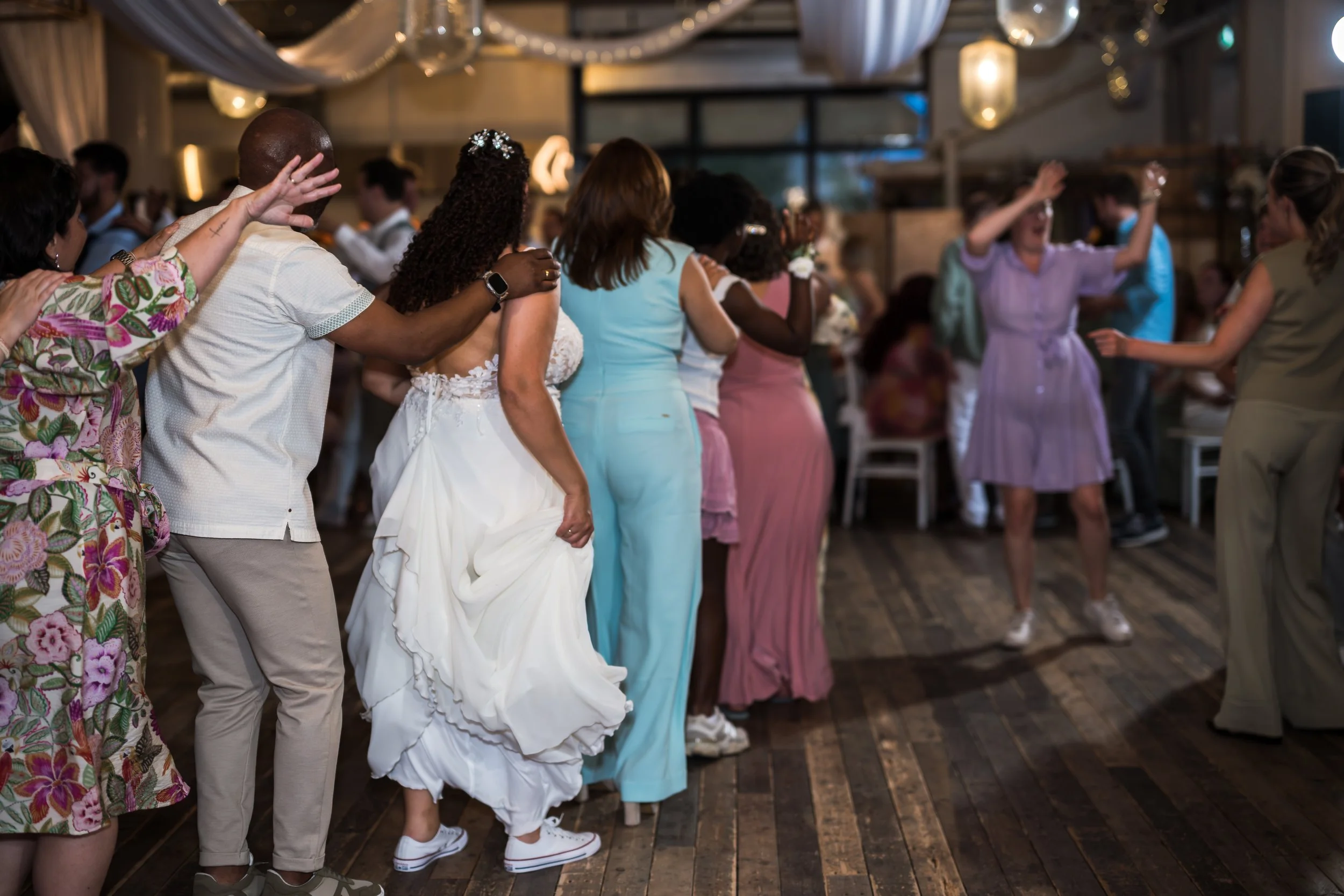 Group of diverse people dancing at a lively wedding reception, with a bride in a white gown in the center.