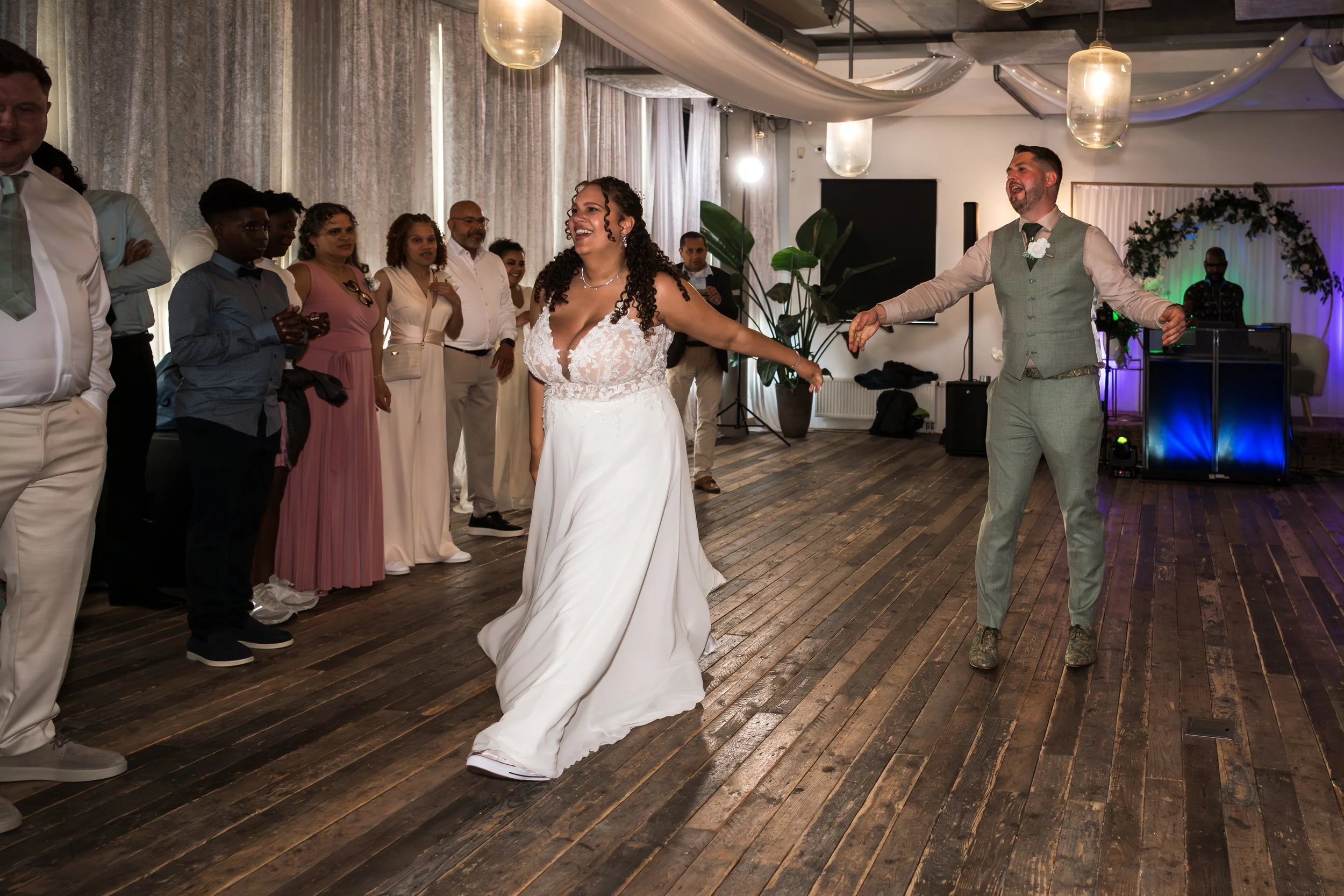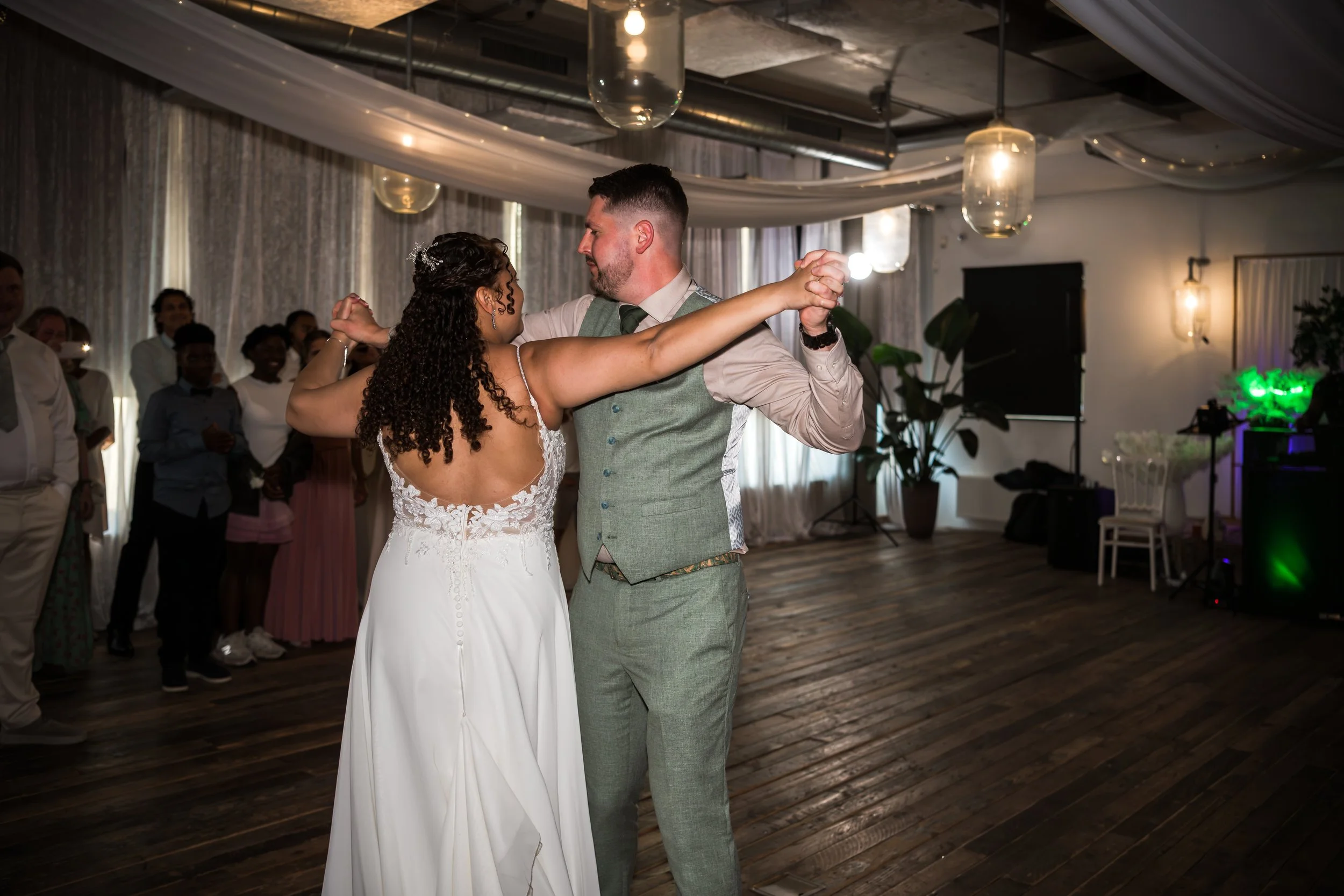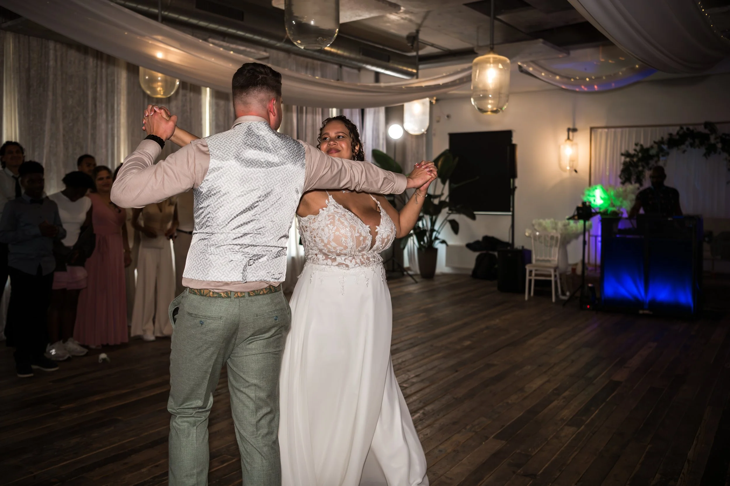 A bride and groom dancing together at their wedding reception, surrounded by guests, with dim lighting and decorative drapes in the background.
