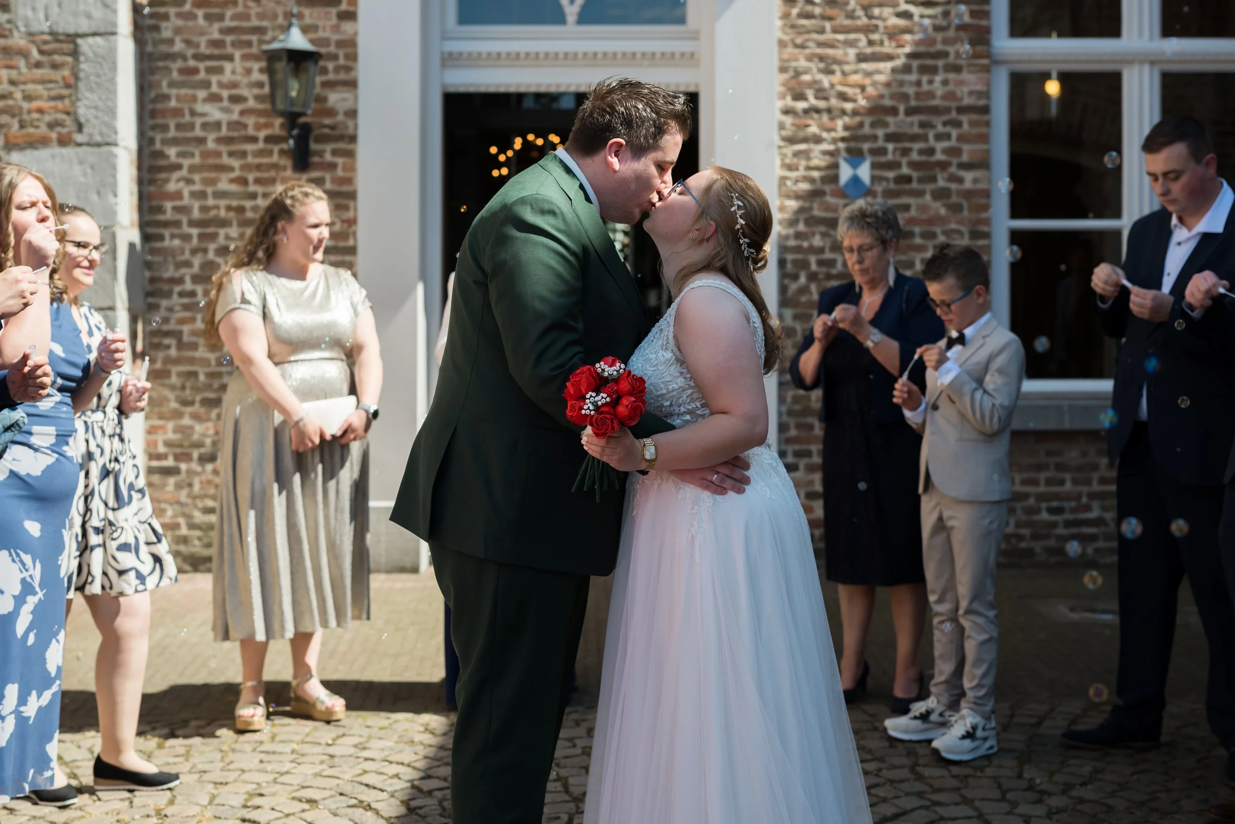 Bride and groom kiss during wedding celebration outside a brick building, surrounded by guests holding bubbles.