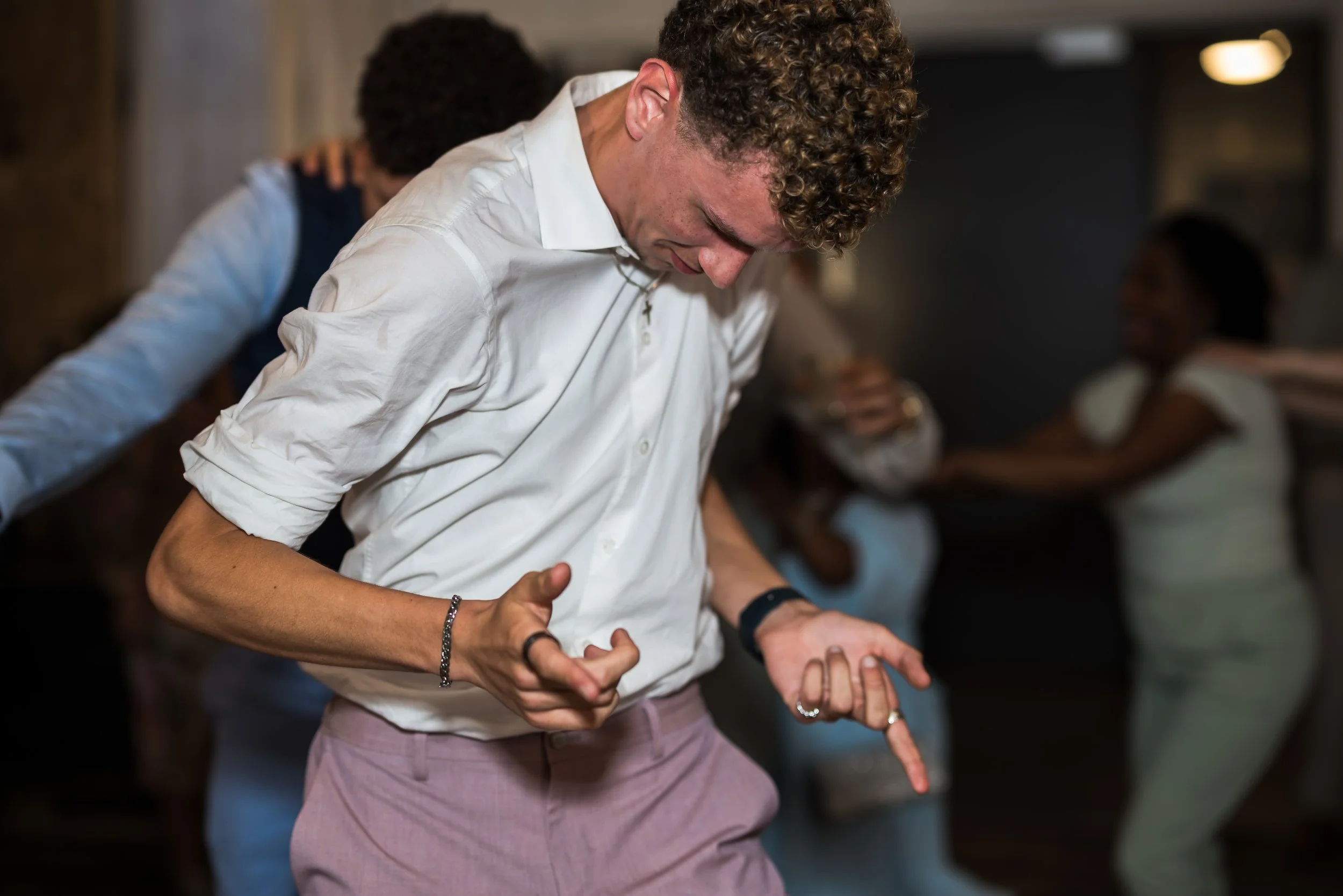 People dancing at a wedding reception, including a woman in a white wedding dress and a man sitting on a chair clapping, with guests dancing in the background.