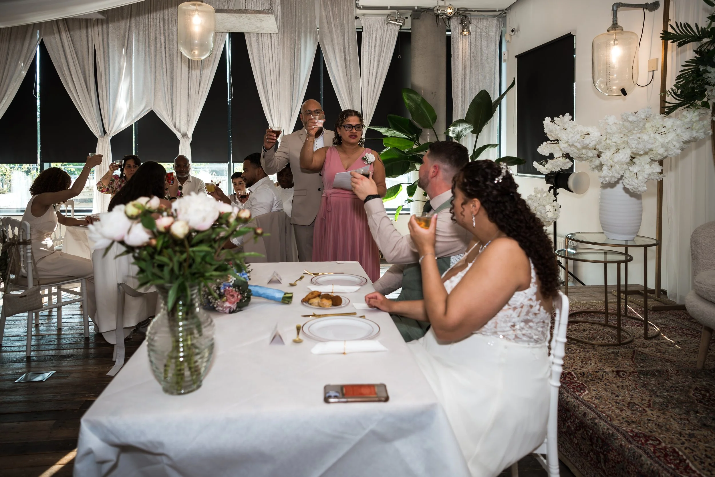 Guests at a wedding reception raising their glasses in a toast, with a woman giving a speech. The scene features a decorated table with floral centerpieces, and the room has large windows with white curtains, greenery, and elegant lighting.