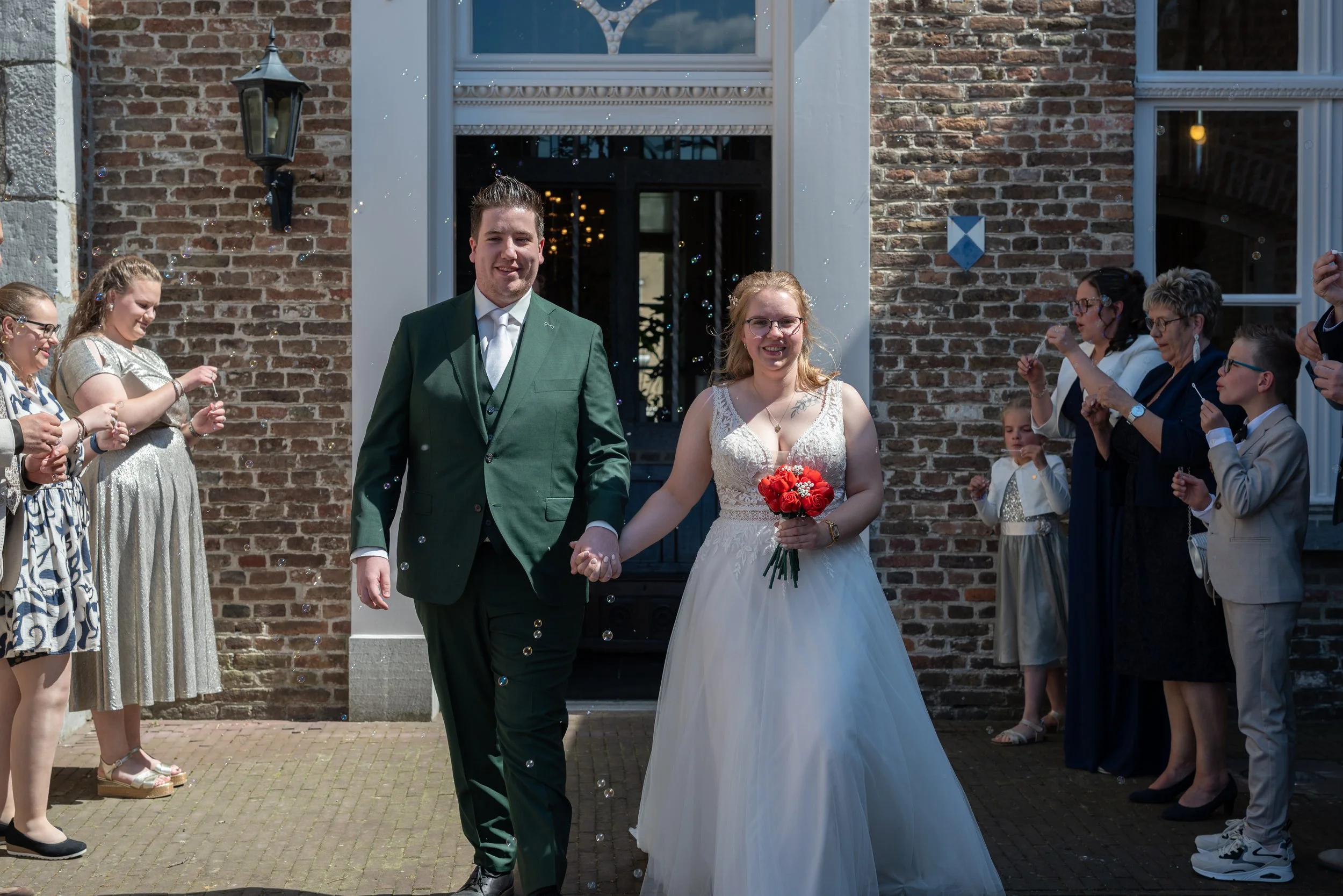 Bride and groom exiting a building, holding hands, surrounded by friends and family, with confetti and bubbles, celebrating a wedding outdoors.