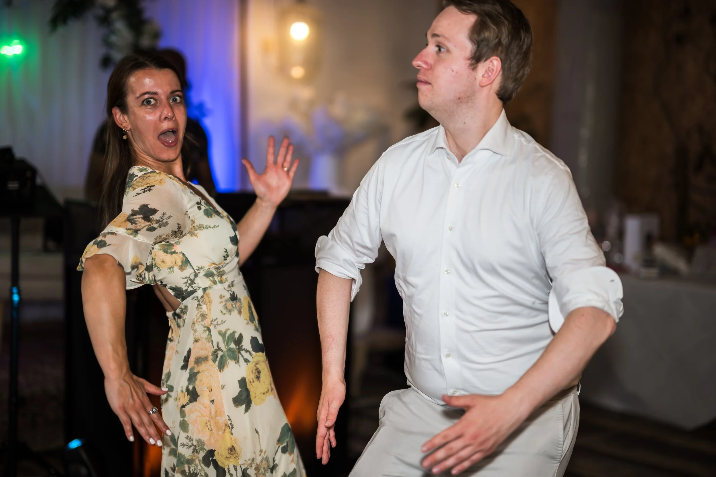 A woman with long brown hair in a floral dress appears surprised with her mouth open and hand raised while a man in a white shirt and beige pants looks to the side with a neutral expression, at an indoor event with colorful lighting.