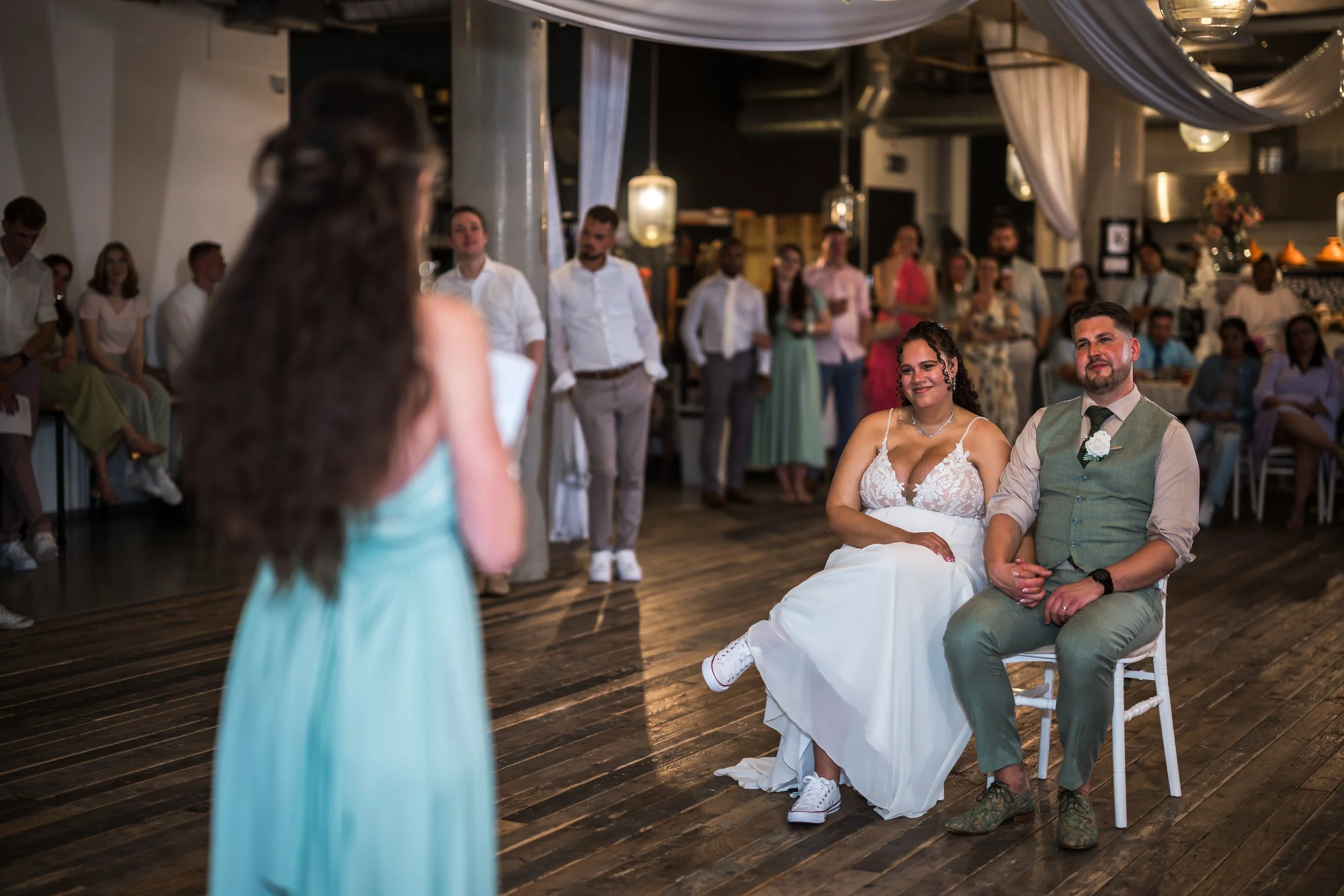Bride and groom sitting on chairs while guests watch a speech at a wedding reception.