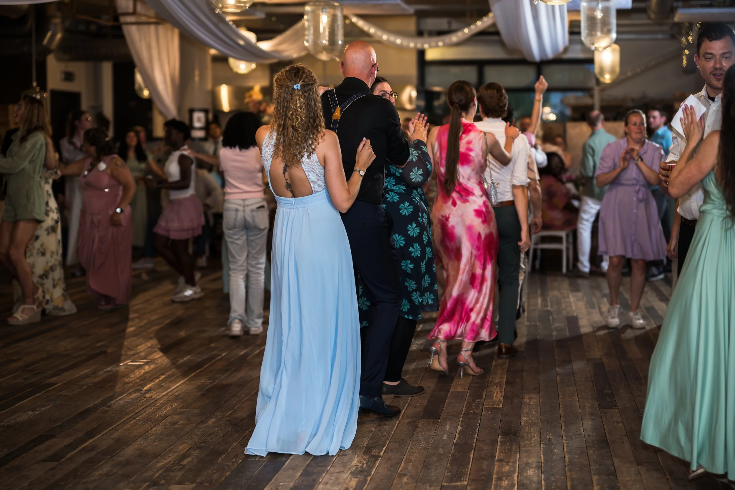 Group of people dancing at a wedding reception in a decorated indoor venue with draped fabric and hanging lights.