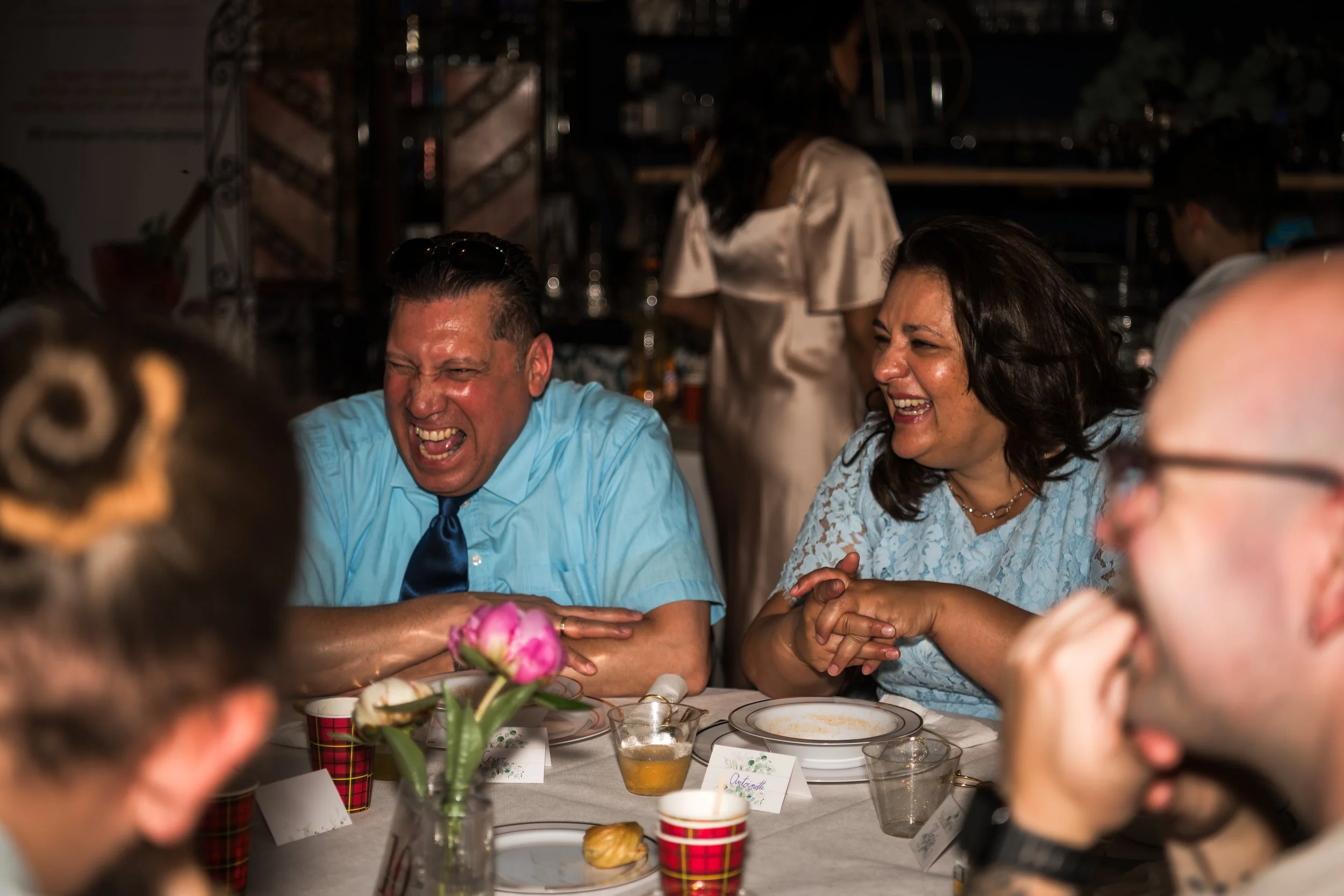 Group of people sitting at a table, laughing and enjoying a meal at a celebration dinner.