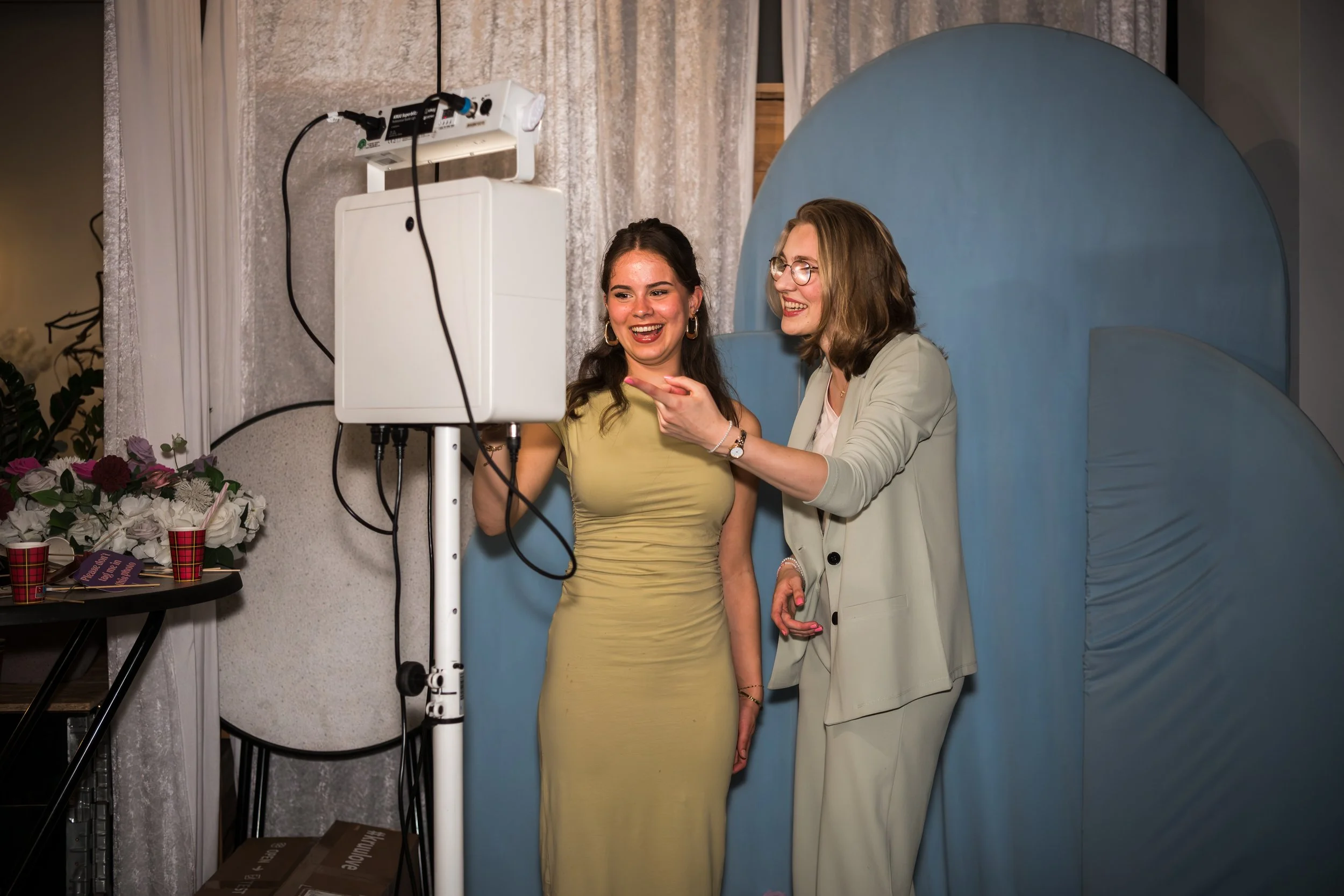 Two women smiling and posing for a photo in front of a photo booth with a privacy curtain background, one woman wearing a yellow dress and the other wearing a light-colored suit.