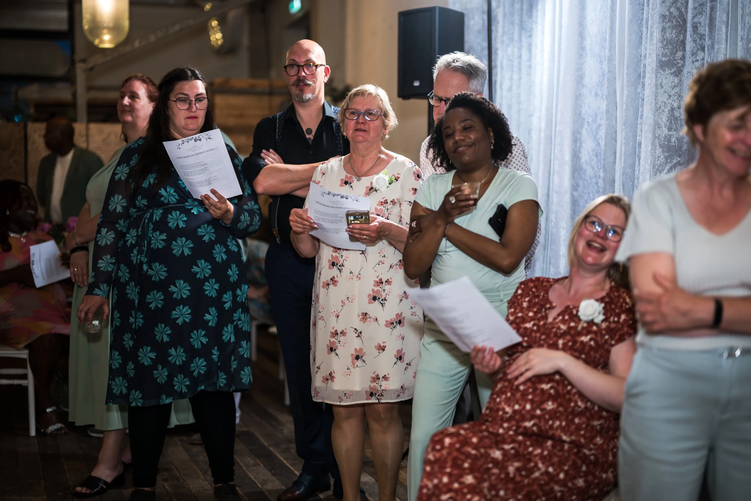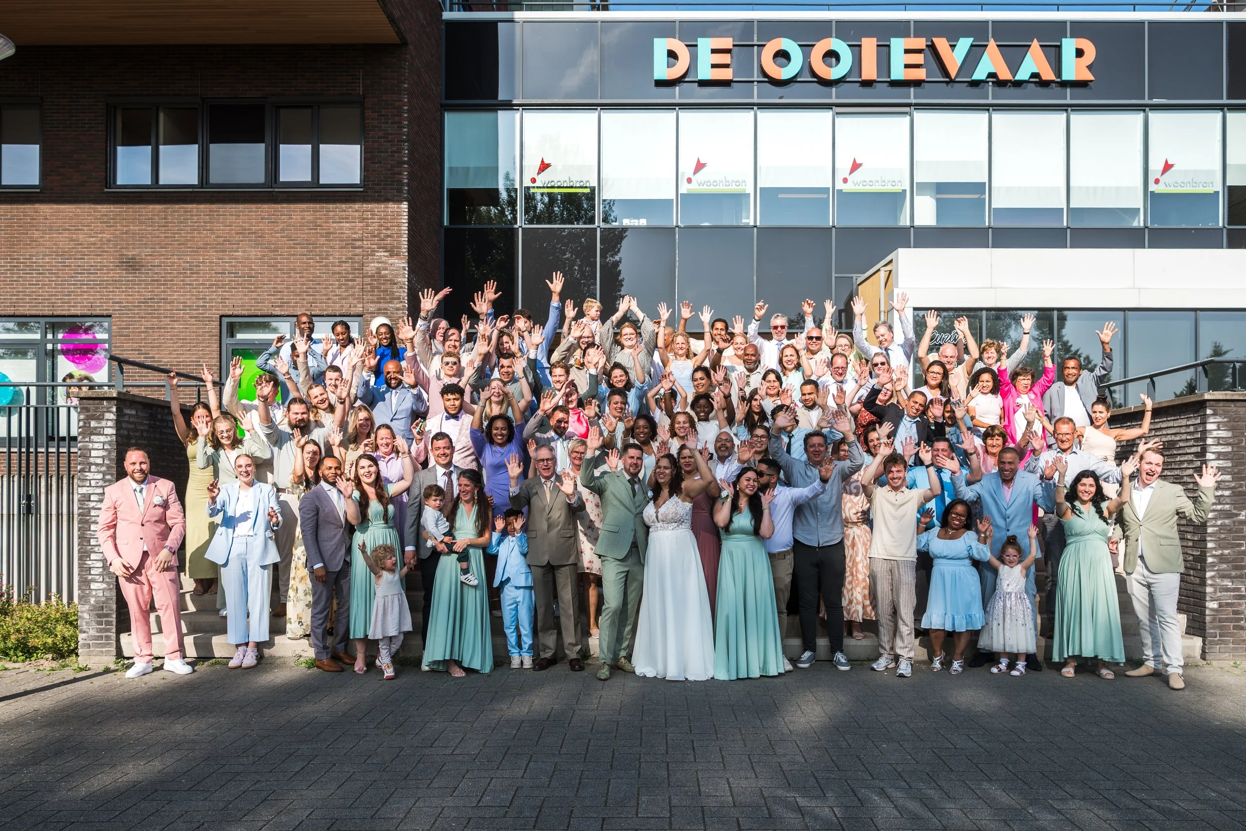Large group of people gathered on steps in front of a building with a sign that reads 'DE OOTVAAR,' raising their hands cheerfully for a group photo. The group includes men, women, and children dressed in colorful formal wear, suggesting a celebratio
