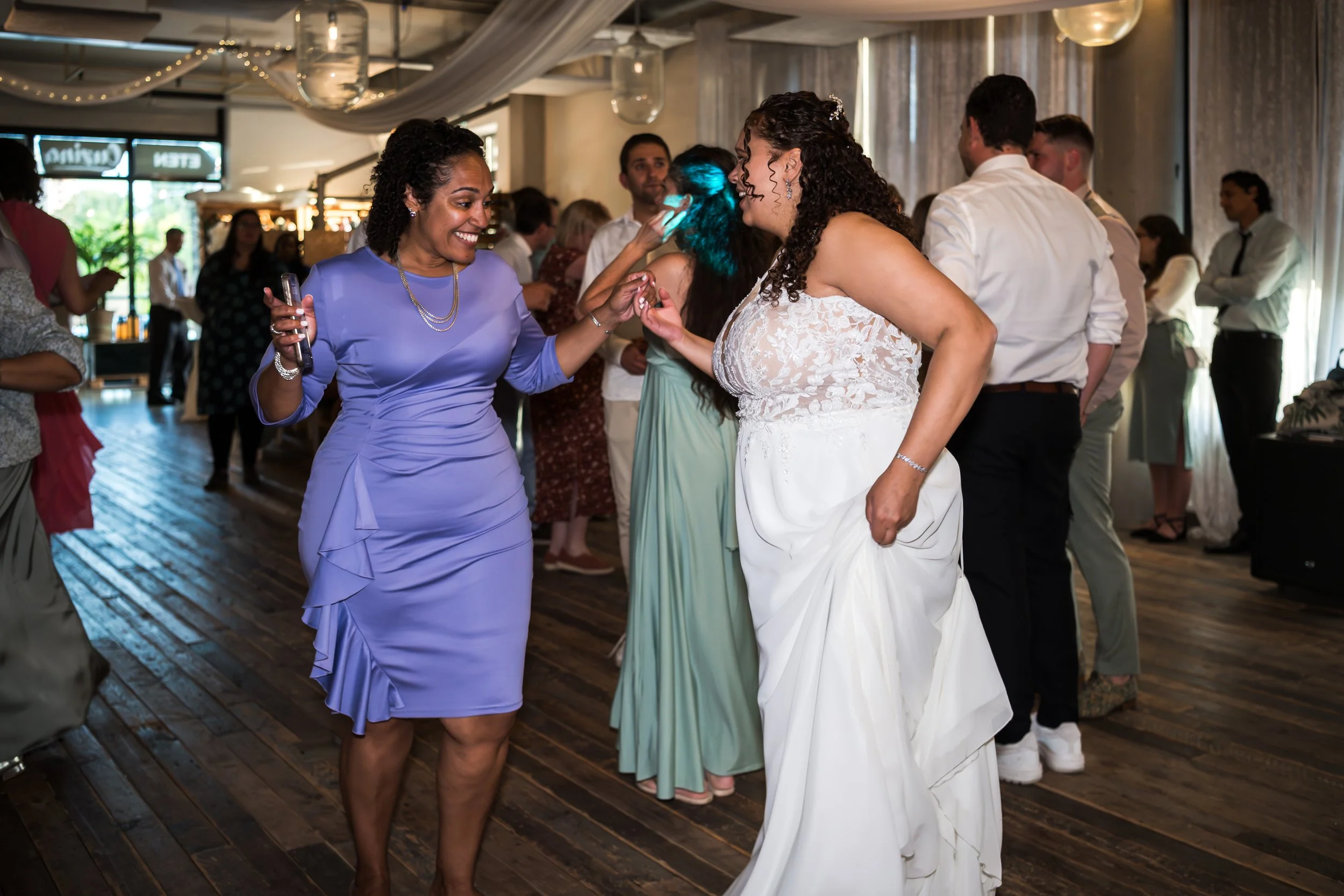 Two women dancing and smiling at a wedding reception, with other guests in the background.