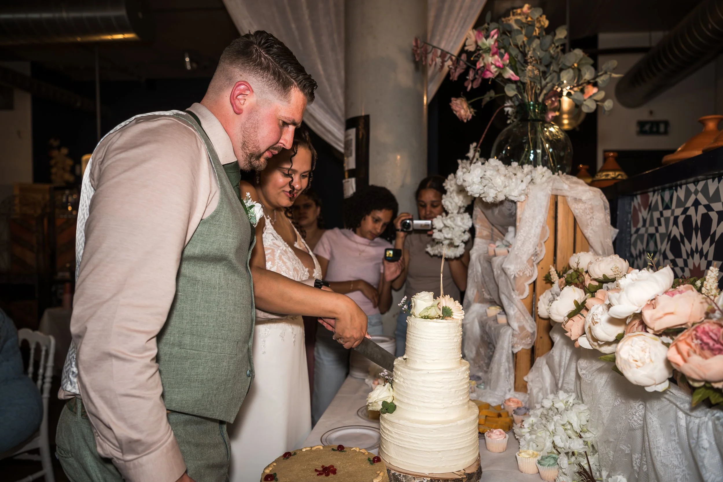 A couple is cutting a wedding cake while guests look on and take photos in a decorated reception area.