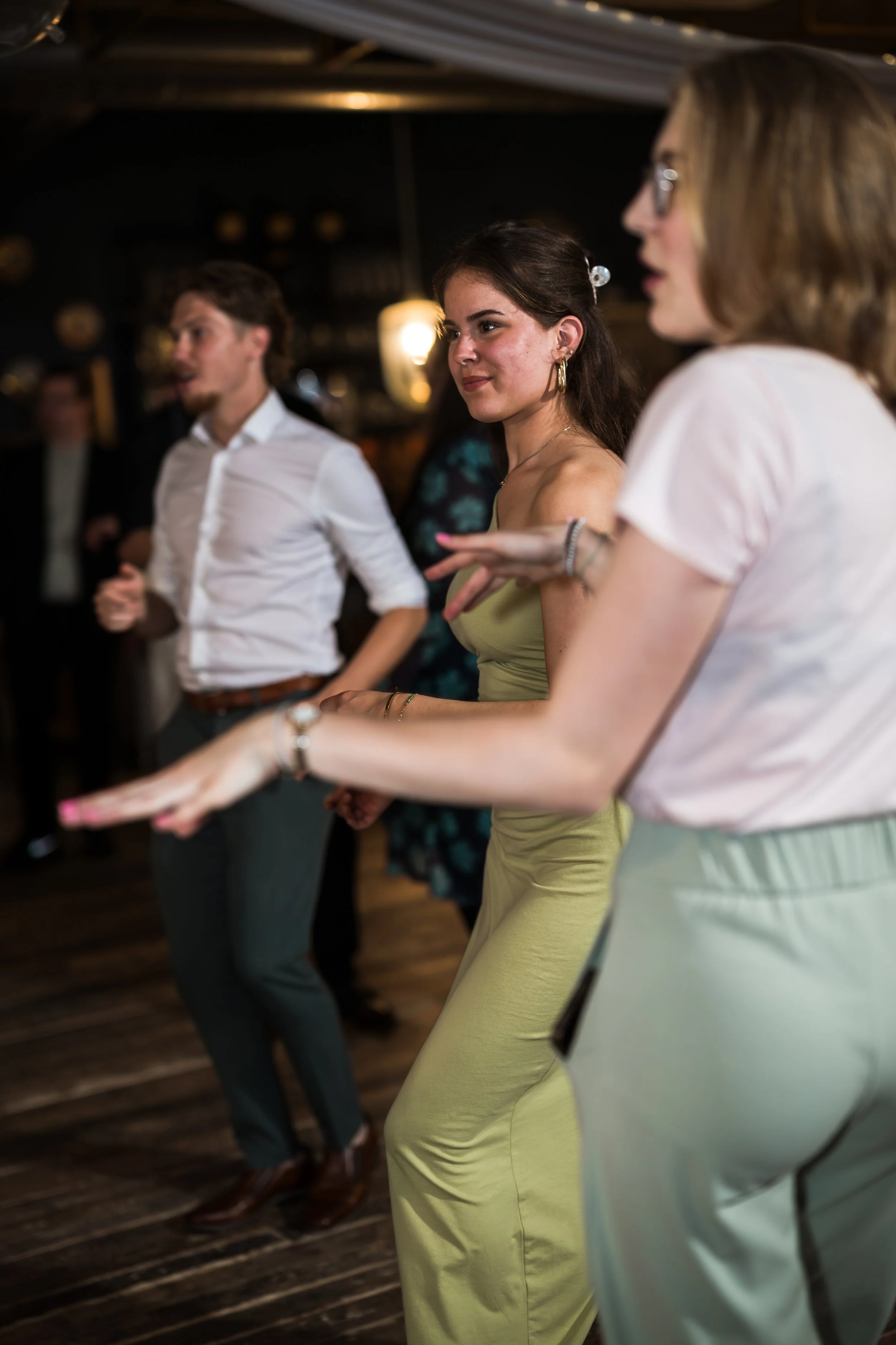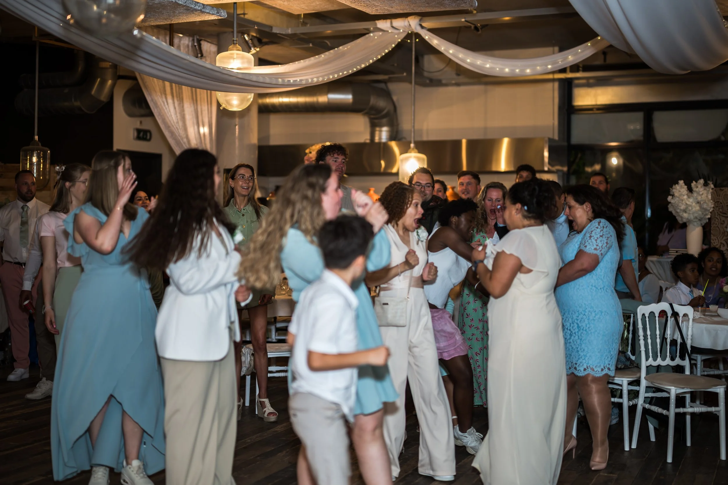 A group of people dancing and having fun at a celebration in a decorated indoor venue.