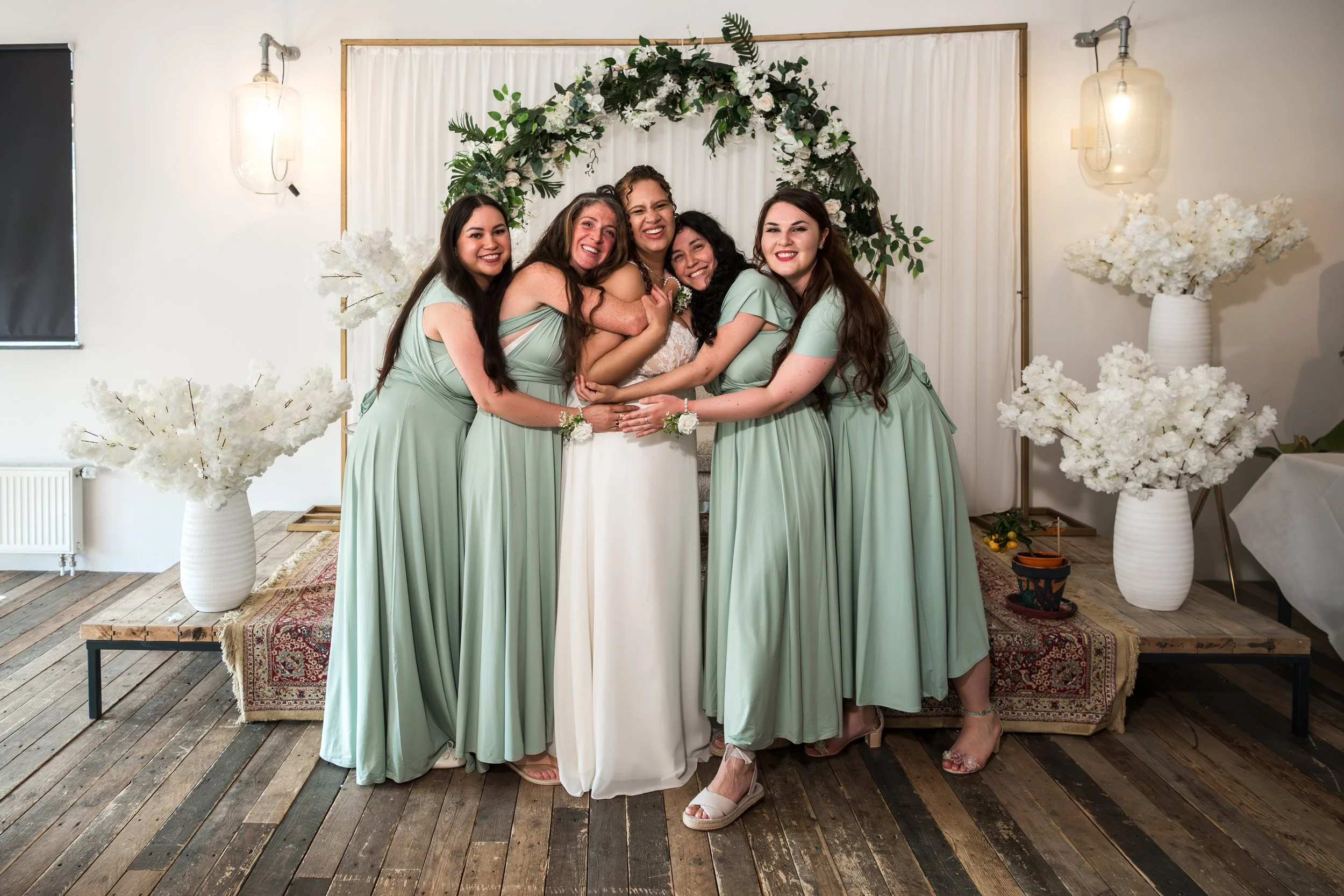 A bride in a white wedding dress surrounded by five bridesmaids in light green dresses, all smiling and hugging in front of a decorated wedding backdrop with white flowers and greenery.