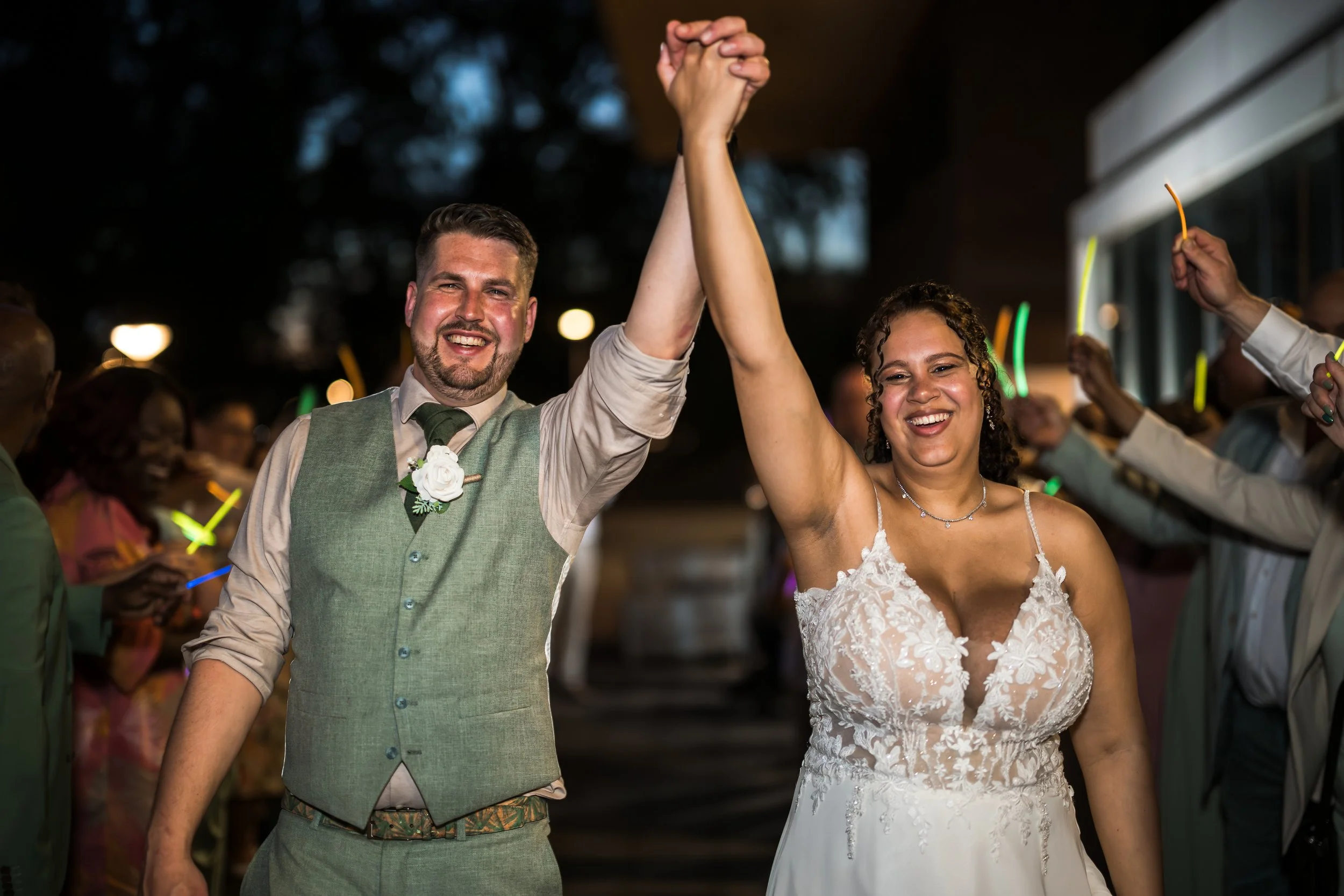A newlywed couple celebrating at their wedding reception, holding hands up in victory, surrounded by guests holding glow sticks, with smiles on their faces at night. View fullsize