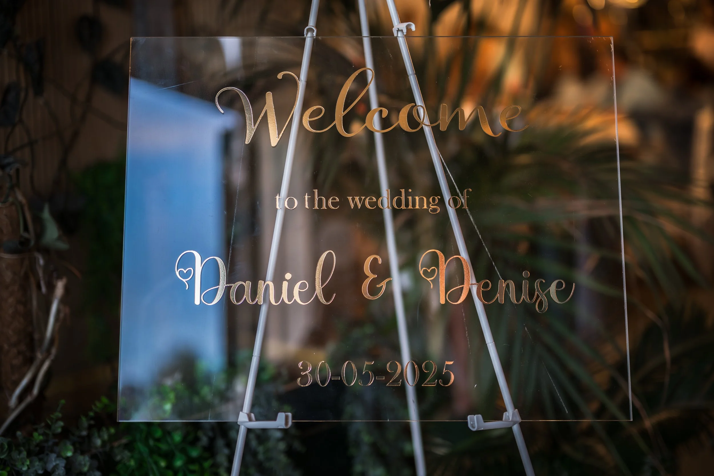A transparent sign on an easel reads, "Welcome to the wedding of Daniel & Denise 30-05-2025," with decorative text and hearts.